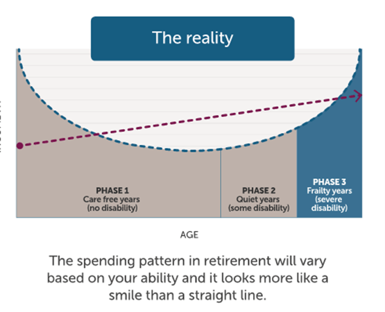 While lifestyle spending does tend to reduce as we progress through retirement, expenses can ramp up again during the “frailty” years – on average, the last three to five years of life, generally after age 80. It is during this phase that we are likely to have some form of disability caused by ageing which causes a general decline in independence. And we may become more reliant on others.